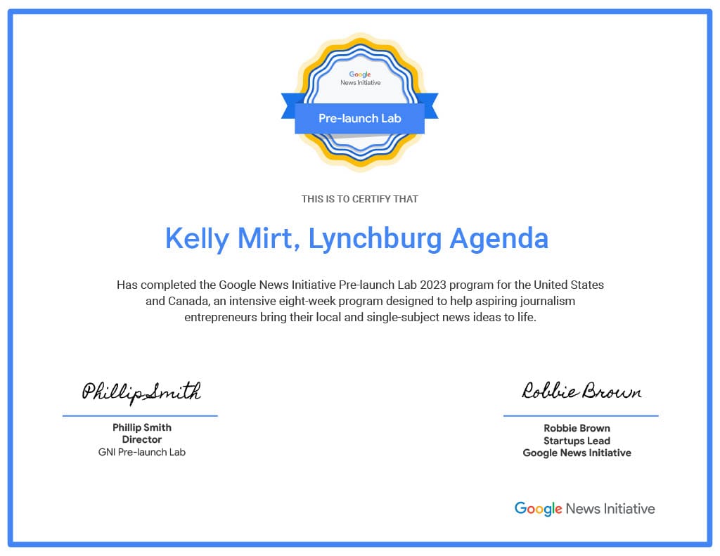 Surrounded by a diverse group of digital publishers, industry experts, and successful digital entrepreneurs, all serious about local news, I dove into an intensive eight-week bootcamp. There, I learned about the transformative power of artificial intelligence in optimizing workflows, generating images, and editing content. More importantly, I learned to engage with my community directly to discover the local news and information they truly need and want. This experience helped me establish significant connections and gather best practices nationwide—resources that now enhance the content of Lynchburg Agenda.