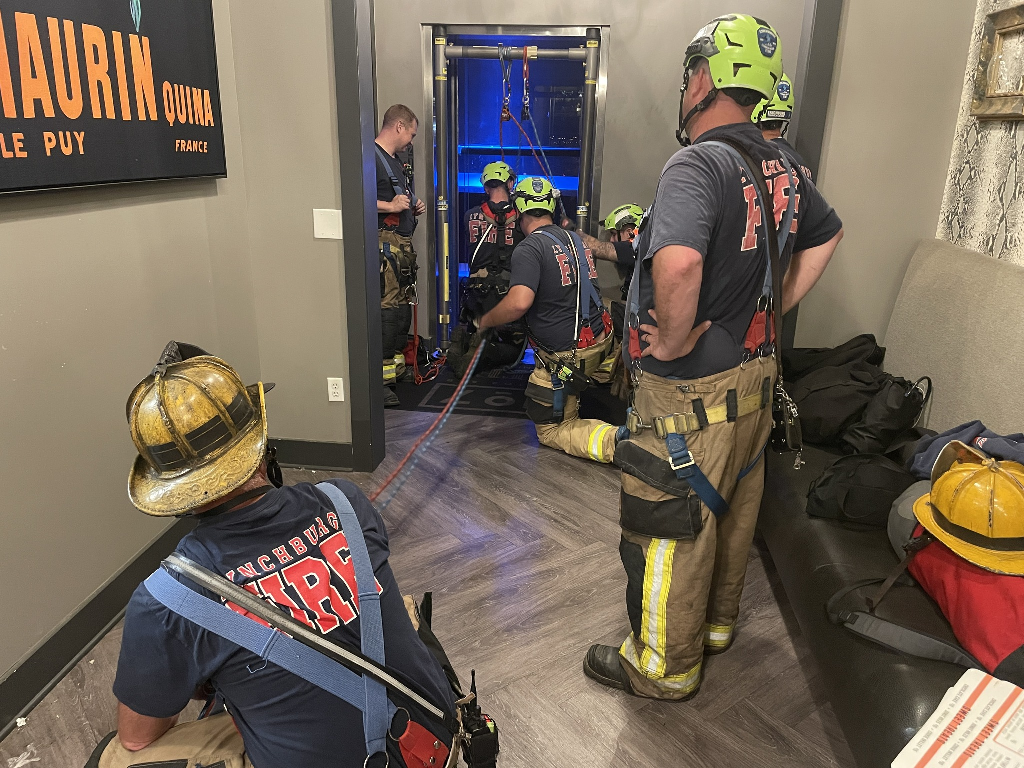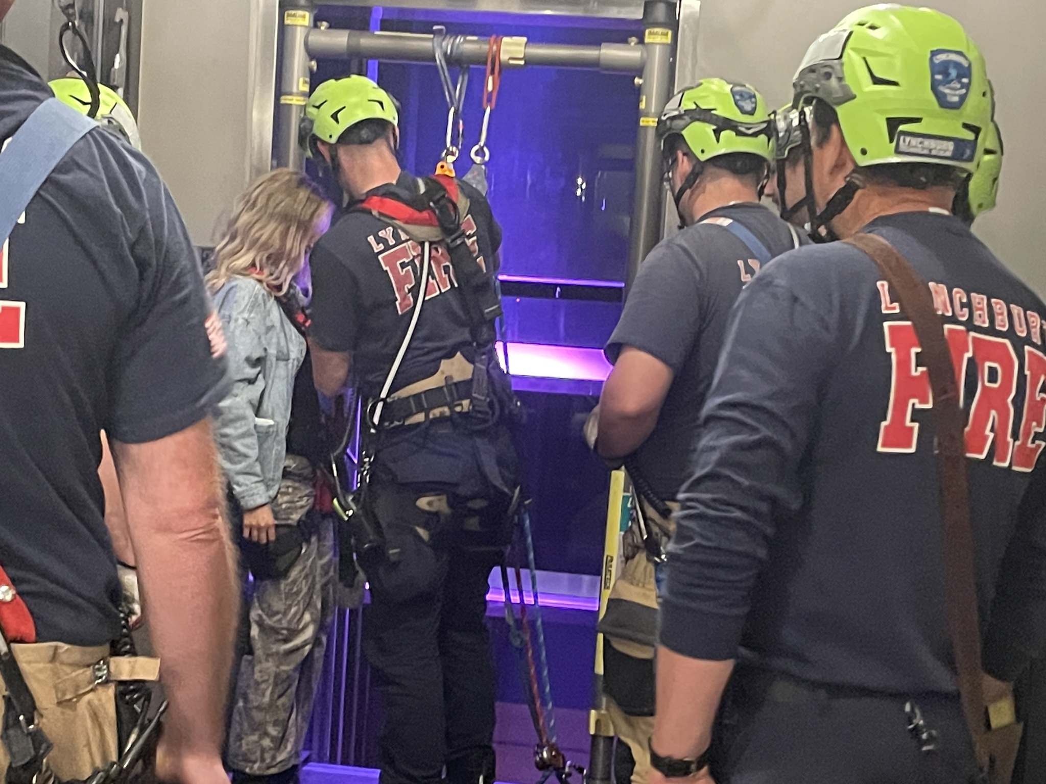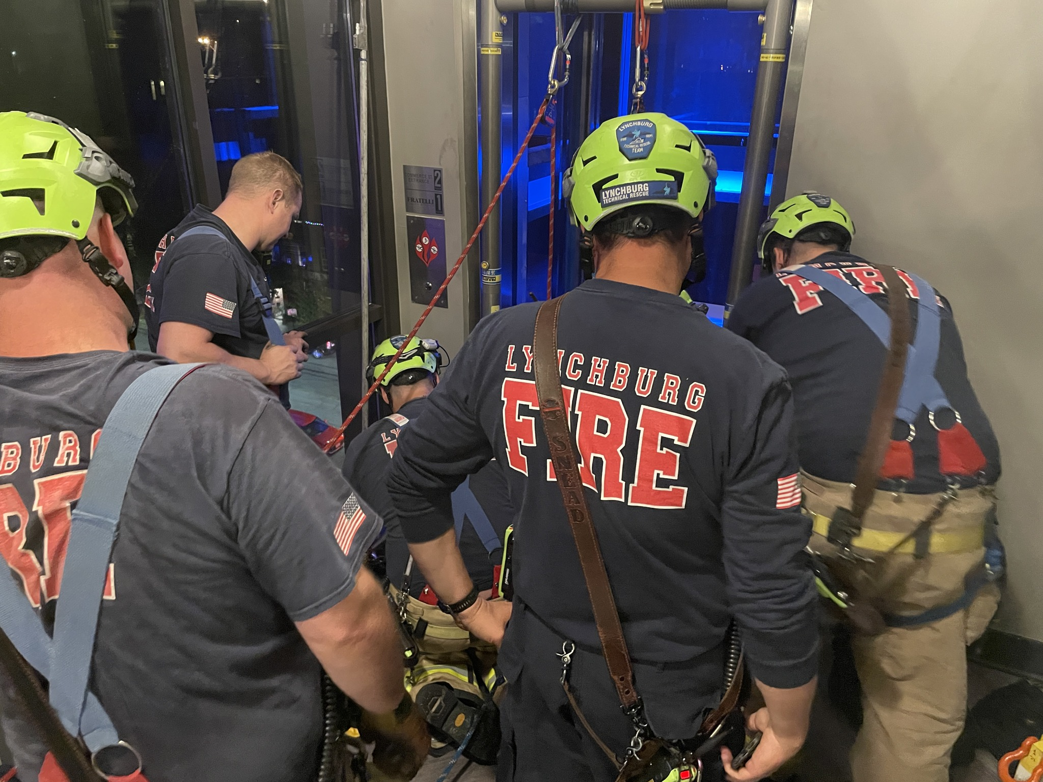 According to the Lynchburg Fire Department, the group was leaving 7 Rooftop Bar around 11:30 p.m. when the elevator suddenly stopped near the third floor. Because the building uses a “blind” elevator — one without doors on every level — crews couldn’t access the car from a hallway.