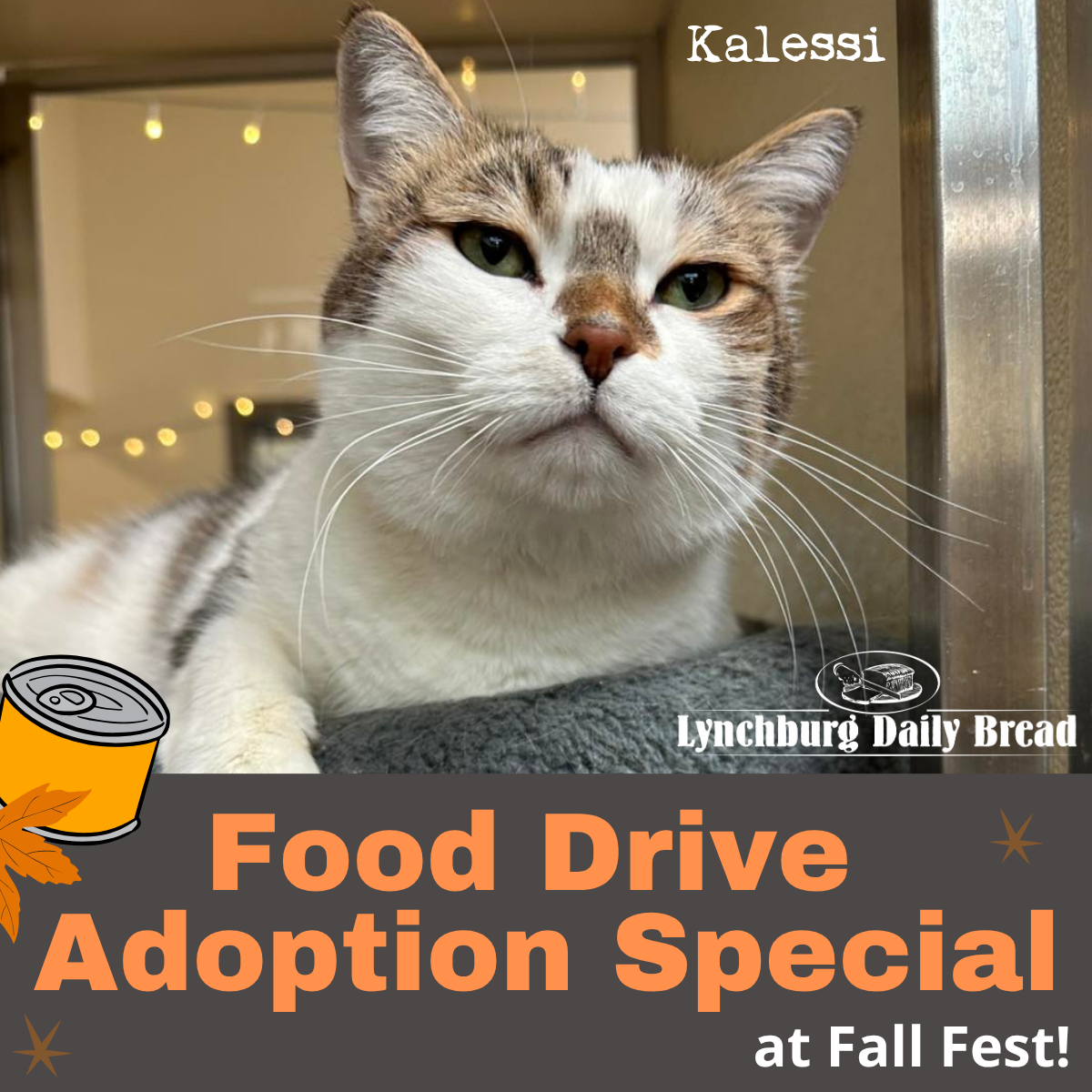(November 13, 2025)— Lynchburg Humane Society is holding their annual maker vendor festival, “FALL FEST,” event this Saturday, November 15th, from 2:00 p.m. to 5:00 p.m., and during their open hours that day, 11:00 a.m. - 5:00 p.m., they’re also celebrating with an adoption special. During the “Food Drive Adoption Special,” all pets (excluding VIPs) will have their adoption fees reduced to $50, with the opportunity to lower ANY adoption fee even more by bringing a canned human food item (or three!) to donate to the Lynchburg Daily Bread. For every canned food item adopters bring, they will receive an extra $10 off any adoption fee, including those for VIPs, up to $30 off.