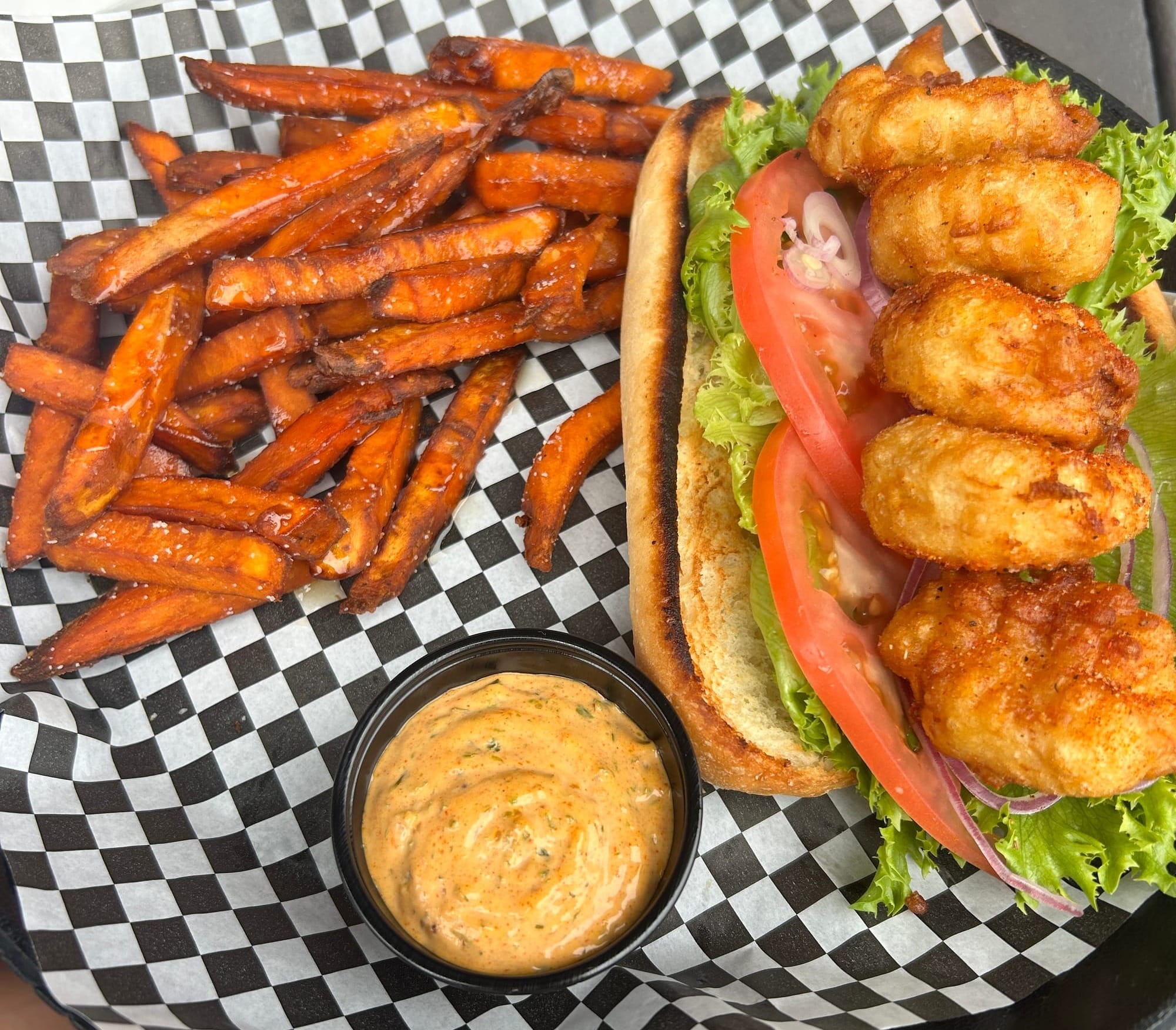 Pivoting from the special, the shrimp po’ boy was the clear redemption arc of the meal. Generous in size and packed with impressively large, crispy fried shrimp, it delivered everything the earlier dish promised but didn’t quite achieve. It was hearty, satisfying, and easily shared exactly what you want from a sandwich in this category.